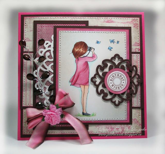 I have chosen a Tiddly Inks digital stamp called You and Me for this card. The arch was made with the Spellbinders Layered Elegant Swirl die. I find I'm using that a lot lately. Flowers are WOC and I've been hoarding that delicious ribbon for about 4 years now. I only bought a wee bit of it at the time because of the cost and added Fray Block to the cut ends to prevent fraying. The 2 hearts die was borrowed from a very good friend and is called Love Language from Cuttlebug. Diamond Dust was applied to add some bling. DP is English Rose Collection from Kaisercraft.